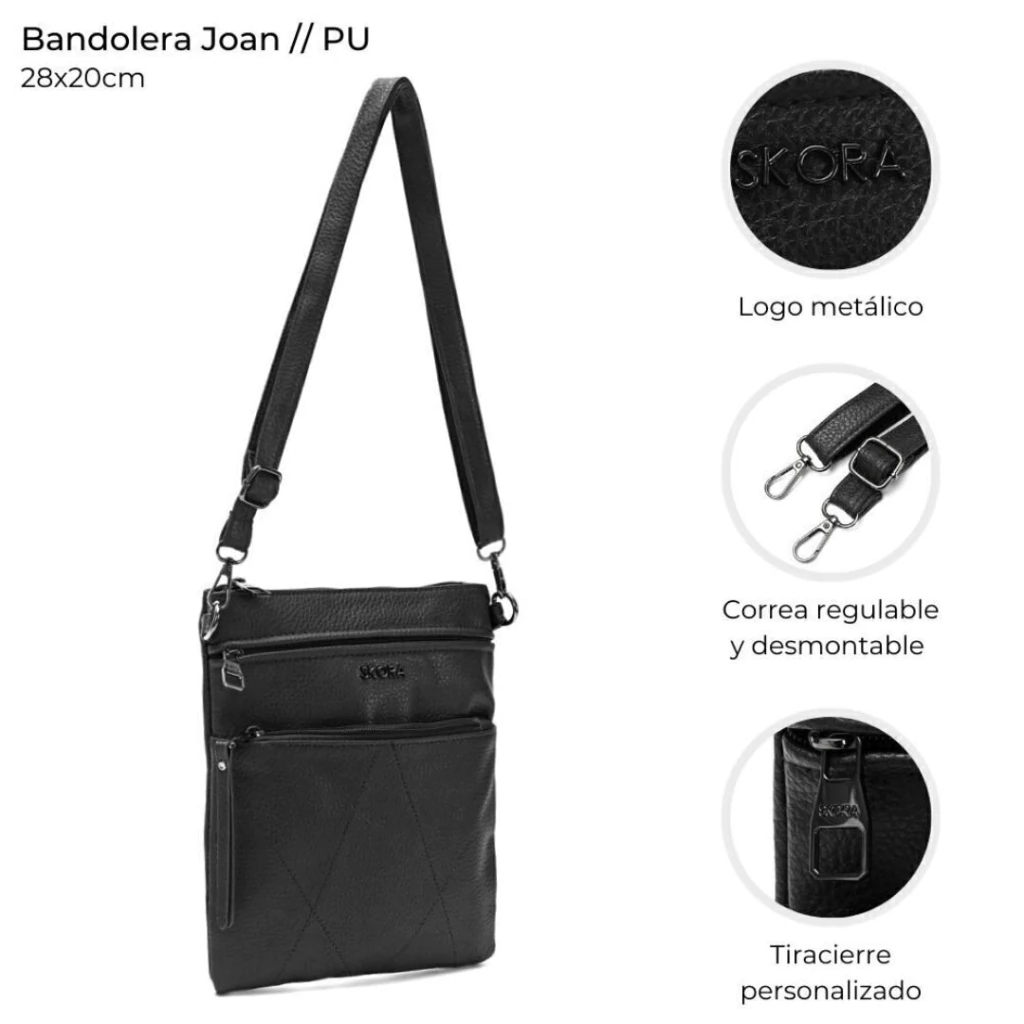 BANDOLERA SKORA DE CUERO SINTETICO 3 CIERRES 28X20X8 COLOR NEGRO PRECIO UNITARIO (38188)